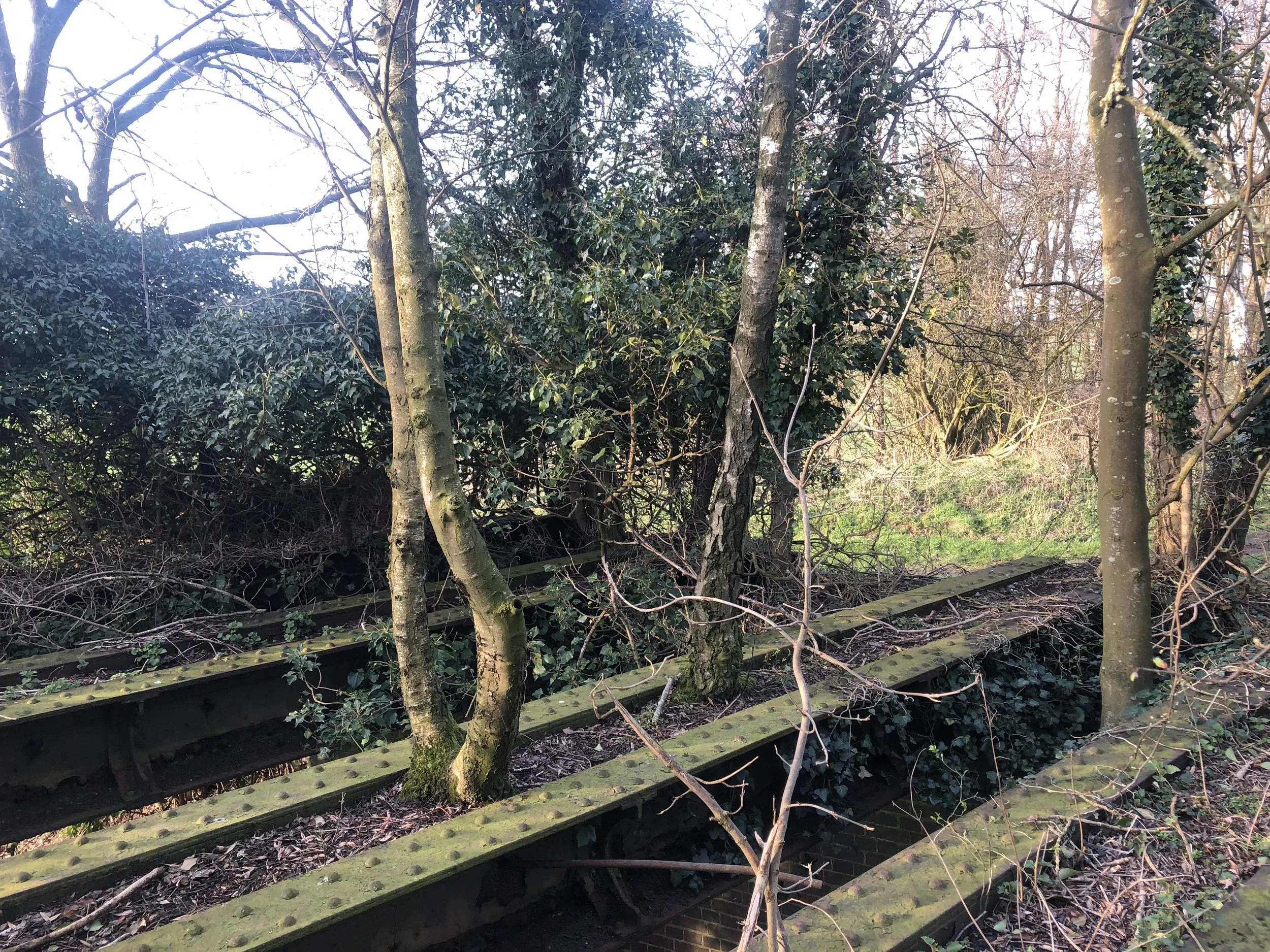 When we arrived at Gayton Road, the bridge that once crossed the road just before the station was now completely gone, and the road levelled. Gayton Road Station itself remains in small proportions, with the buildings gone, apart from a small brick part of the waiting room, and the two platforms remain but look to have been shortened. The land surrounding Gayton is very boggy in the winter and very overgrown in the Summer. Leaving Gayton Road, the railway passed underneath a road bridge that remains in Bawsey Country Park and then passed under a smaller farm crossing bridge that also remains. Before entering a cutting and passing underneath a small farm bridge, all that remains here is one small concrete part of the bridge, and the cutting has been refilled and returned to farming fields. Shortly after, the Lynn Dereham bridge crossing still survives in small parts, and the buttresses remain, with the bridge crossing having been removed. The Lynn Dereham railway below is still used daily, transporting freight services from Middleton Towers station, transporting sand. Passing the bridge, the old track bed remains and is now repurposed as a farm track, with two small drainage crossing bridges remaining. Passing underneath the A47 and bearing around the Hardwick Narrows industrial estate, an old bridge hidden within the industrial estate is said to survive still, but is challenging to get to. The line would pass over the Lynn Ely line; all that remains is one buttress from the railway crossing, which was part of the farm underpass that ran alongside the Lynn Ely line. The raised track bed still exists, as does Bridge PmY2-53, which is accessible via the Nar Valley walk. The bridge that once accommodated the Lynn Sutton Bridge railway and later the Lynn Shuttle services heading towards South Lynn also survives.
