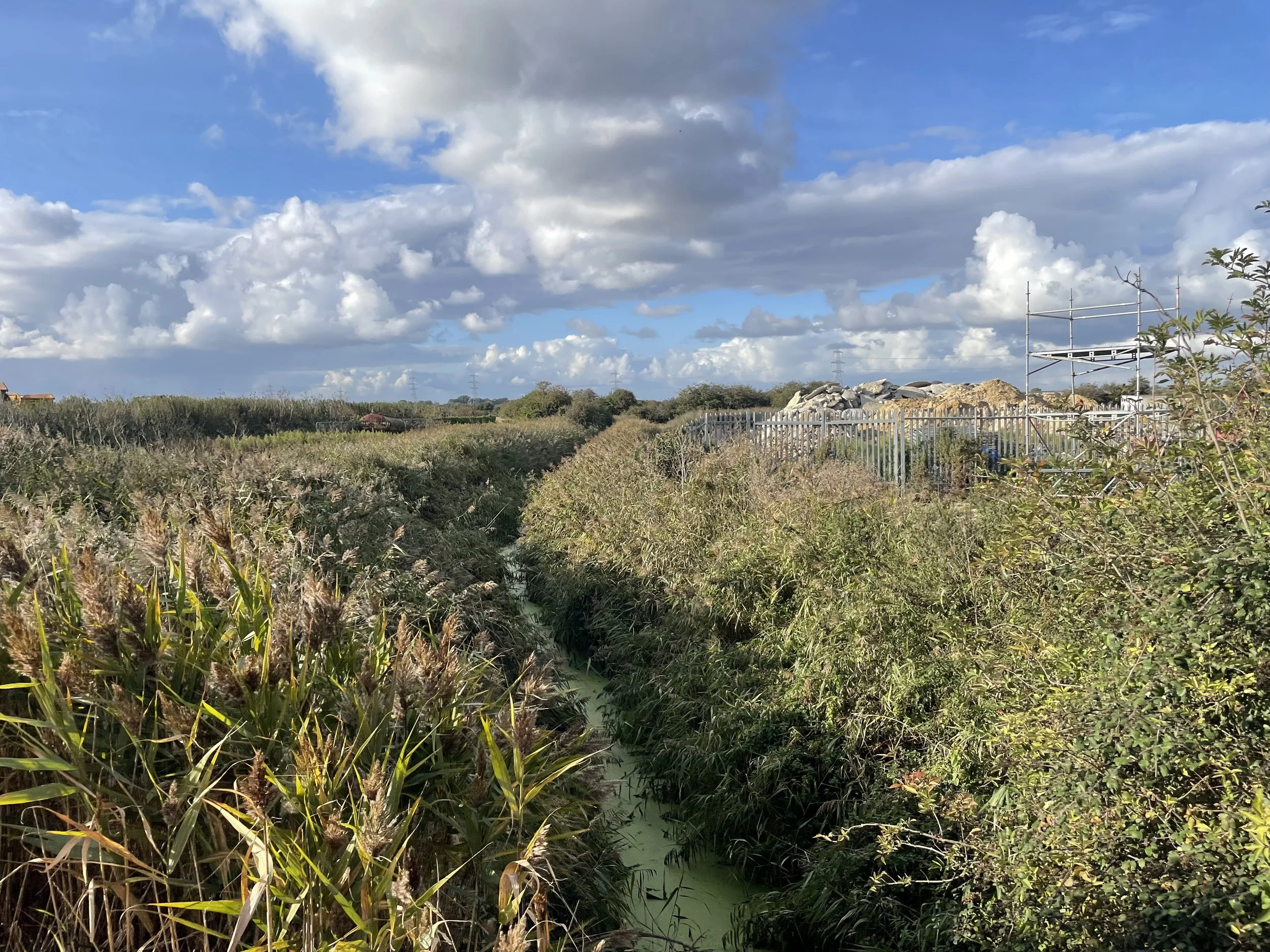 The route of the old railway line remains unblocked and follows the side of the industrial site, passing by a waste management yard.