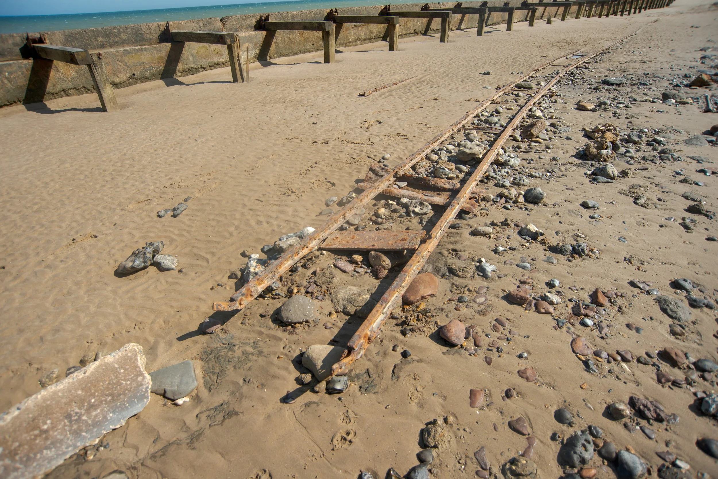 I will provide a brief overview of an old narrow gauge railway that used to run along the coast. Unfortunately, there isn't a lot of information available on this fascinating piece of history. It's unclear why the railway was built so close to the beach, but there are a few theories. One possibility is that it was used to remove World War II bombs, while another suggests that the railway played a role in coastal sea defenses. After conducting some research, it seems that remnants of the railway are linked to the construction of these sea defenses. Unfortunately, the area was eventually abandoned due to landfalls caused by sea erosion, and it was left to be reclaimed by nature. The cost of recovery was deemed too high. If anyone has additional information on this topic, please don't hesitate to get in touch.